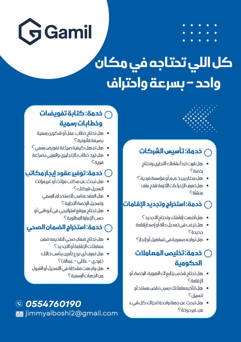 سواء كنت مستثمر جديد أو صاحب خبرة، نحن شريكك الموثوق لبدء أعمالك في الإمارات. من إصدار الرخص التجارية إلى تأسيس الشركات وخدمات الإقامة، نقدّم لك حلول شاملة وسريعة. خدمات PRO عندنا مصممة لتخليك تركز على نجاحك، ونضمن لك إن الإجراءات تتم بسلاسة، بلا صداع وبلا تأجيل